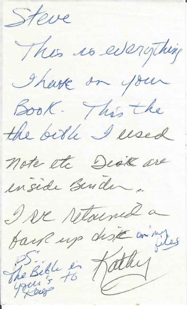 I THANK YOU... KATHLEEN HARPEE; NOT JUST BECAUSE OF THE HOURS SPENT ON TYPING THIS PROJECT, BUT BECAUSE OF YOUR LOVE TO GOD.  FOR ALL OF THIS WAS PLANNED AND YOUR PART IN IT, WAS VERY MUCH APPRECIATED!