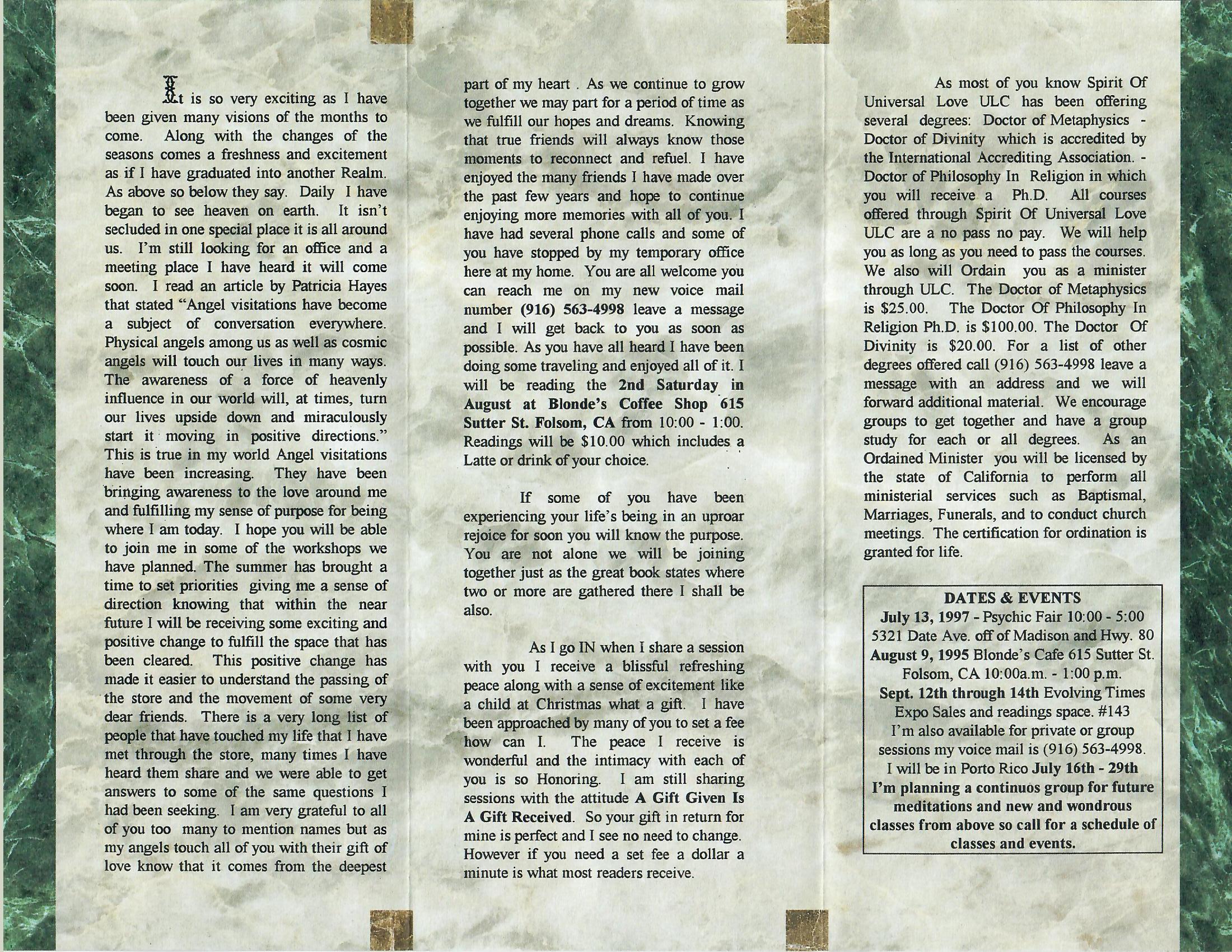 WE MET IN A CHURCH 1991 THE REASON WAS THERE.  SHE HAS BEEN GIFTED IN SUCH A WAY... THAT IT IS A TREAT TO BE READ BY HER.  WE WERE GUIDED TO MEET FOR THE TIME IS NEAR.  THROUGH OUR CONTACT SHE WAS INFORMED WHAT TO DO... SO CLEAR WAS HER VISION, SHE BEGAN TO WATER THE SEED.  I SINCERELY; THANK YOU, FOR EVERYTHING YOU HAVE GIVEN... GOD BLESS YOU... MARLENE O'NEILL IN ALL THAT YOU HAVE DONE!!!